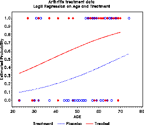 The DATA step below creates a SAS data set named arthrit, in case form. It is equivalent to the earlier example, but contains the age of each person in the sample. Programming statements are used to create dummy variables _sex_ and _treat_ as before. Variables for testing for interactions among sex, treatment and age are also created. A preliminary analysis (described later) is used to test whether any of these variables interact. That test shows that all interactions can safely be ignored in this example. That test is one suitable test for goodness of fit of the main effects model.