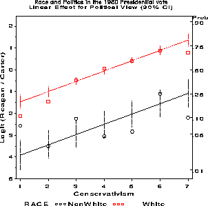 proc catmod data=votes order=data; direct view; weight votes; response / out=predict; model votefor = race view race*view; title2 'Separate slopes for Political View (90% CI)';The results show that this model does not offer a significant improvement in goodness of fit. The plot nevertheless indicates a slightly steeper slope for white voters than for non-white voters.